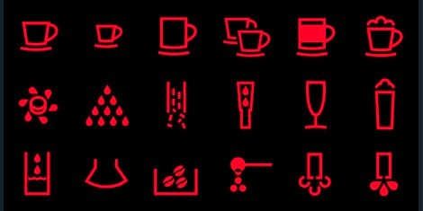 The line of icons was eventually extended to fulfill further needs, comprising signs for other coffee varieties as well as service indicators to replace cartridges, fill water, decalcify and more.
